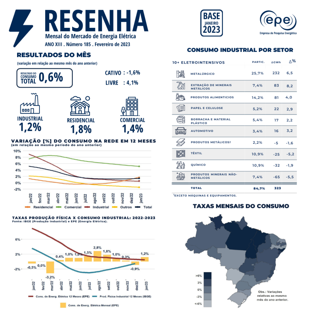 O consumo nacional de energia elétrica atingiu 42.837 GWh em janeiro, crescendo 0,6% em comparação com mesmo mês de 2022, informa o boletim mensal da Empresa de Pesquisa Energética (EPE). A classe residencial (1,8%) puxou a alta, seguida pelas classes comercial (1,4%) e industrial (1,2%). No acumulado em 12 meses a demanda por eletricidade registrou 508.954 GWh, avanço de 1,4% em comparação ao período imediatamente anterior. Com 14.942 GWh, a classe industrial expandiu seu consumo após a retração em dezembro. A região Nordeste (16,3%) liderou o índice, seguida por Norte (7%) e Centro-Oeste (2,9%), enquanto Sul e Sudeste retraíram em 2,5% e 2,3%. Seis dos dez setores mais eletrointensivos se destacaram, como Metalurgia (6,5%), puxado pela cadeia do alumínio primário no Maranhão e no Pará. Contudo, a queda na produção siderúrgica nacional atenuou a forte alta do consumo de energia elétrica no segmento. Também se destacaram a extração de minerais metálicos 8,2%), com Minas Gerais e Espírito Santo respondendo por mais da metade da expansão; e a fabricação de produtos alimentícios (4%), onde as altas nas exportações, principalmente de aves e açúcares e melaços, podem ter contribuído para o resultado. Por outro lado, as maiores quedas ficaram com a fabricação de produtos minerais não-metálicos (5,5%); de produtos químicos 1,9%) e têxteis (5,2%). Paradas de manutenção, férias coletivas, níveis elevados de estoque, além da própria dinâmica dos mercados de seus produtos, podem ter contribuído para a queda no consumo de eletricidade nestes setores segundo a EPE. Nas residências impactos verificados pelo clima um pouco mais seco em relação ao mesmo mês de 2022. As tarifas de energia também estavam mais baixas em relação a janeiro de 2022, o que pode ter contribuído também para o crescimento da demanda, já que no ano passado a bandeira tarifária era de escassez hídrica e agora é verde. Na análise regional, Nordeste (4,4%), Norte (3,2%), Sudeste (1,7%) foram as regiões que contribuíram na classe, enquanto o Sul ficou estável e o Centro-Oeste apresentou retração marginal de 0,4%. Entre os estados, Maranhão (11,7%), Alagoas (10,1%), Pará (9,8%), Roraima (8,2%), Paraíba (7,8%), Tocantins (6,7%), Amapá (6,2%), Minas Gerais e Espírito Santo (5,9%, ambos) lideram a expansão. Em contrapartida apresentaram queda no consumo o Amazonas (9,6%), Mato Grosso do Sul (8,8%), Rio Grande do Norte (4,7%), Rio de Janeiro (4%), Santa Catarina (2,7%), Mato Grosso (1,7%), Distrito Federal (0,7%), Rondônia (0,6%) e Paraná (0,1%). Para os Estados de Santa Catarina e Distrito Federal, se fosse considerado o ajuste pelo ciclo de faturamento das distribuidoras de energia elétrica locais, o consumo de eletricidade teria crescido 2,0% e 2,6%, respectivamente. Nos comércios o bom desempenho do setor de serviços e, em menor grau, das vendas do varejo, continuam motivando a expansão do ramo. As regiões Norte (6%), Sudeste (2,1%) e Sul (0,9%) impactaram no resultado da classe. Por outro lado, Centro-Oeste (1,6%) e Nordeste (0,1%) apresentaram retração. Entre os estados, destaque para crescimento em Roraima (11,7%), Pará e Alagoas (8,7%, ambos). Já entre as reduções constam o Maranhão (7,2%), Mato do Grosso do Sul (6,1%) e Mato Grosso (5,1%). Por fim, quanto ao ambiente de contratação, o boletim da EPE aponta que o mercado livre computou incremento de 4,1% na demanda durante o mês, enquanto o consumo cativo das distribuidoras de energia elétrica recuou 1,6%.